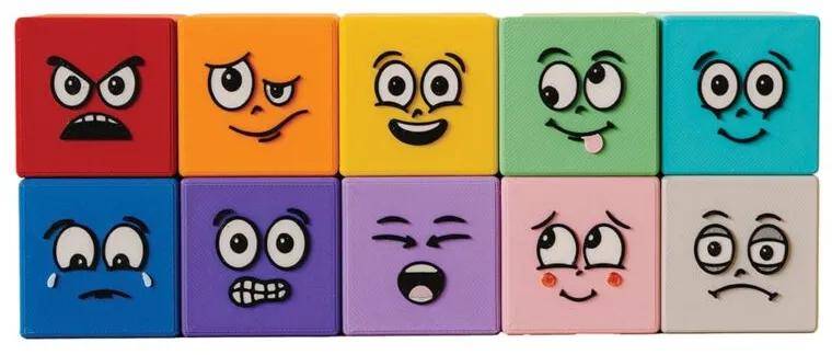孩子们可以用10个色彩鲜艳且富有表现力的方块来识别他们的感受,这些方块体现了不同的情绪,包括快乐、悲伤、愤怒、惊讶等。