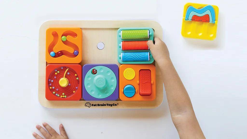 借助这款模块化感官玩具,打造独一无二的感官体验。拿起一块底板,将12块独特且带有磁性的拼块中任选6块嵌入其中,这些拼块设有精细动作挑战、因果关系探索等多样玩法。